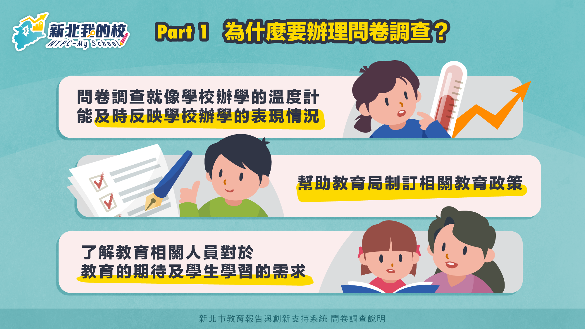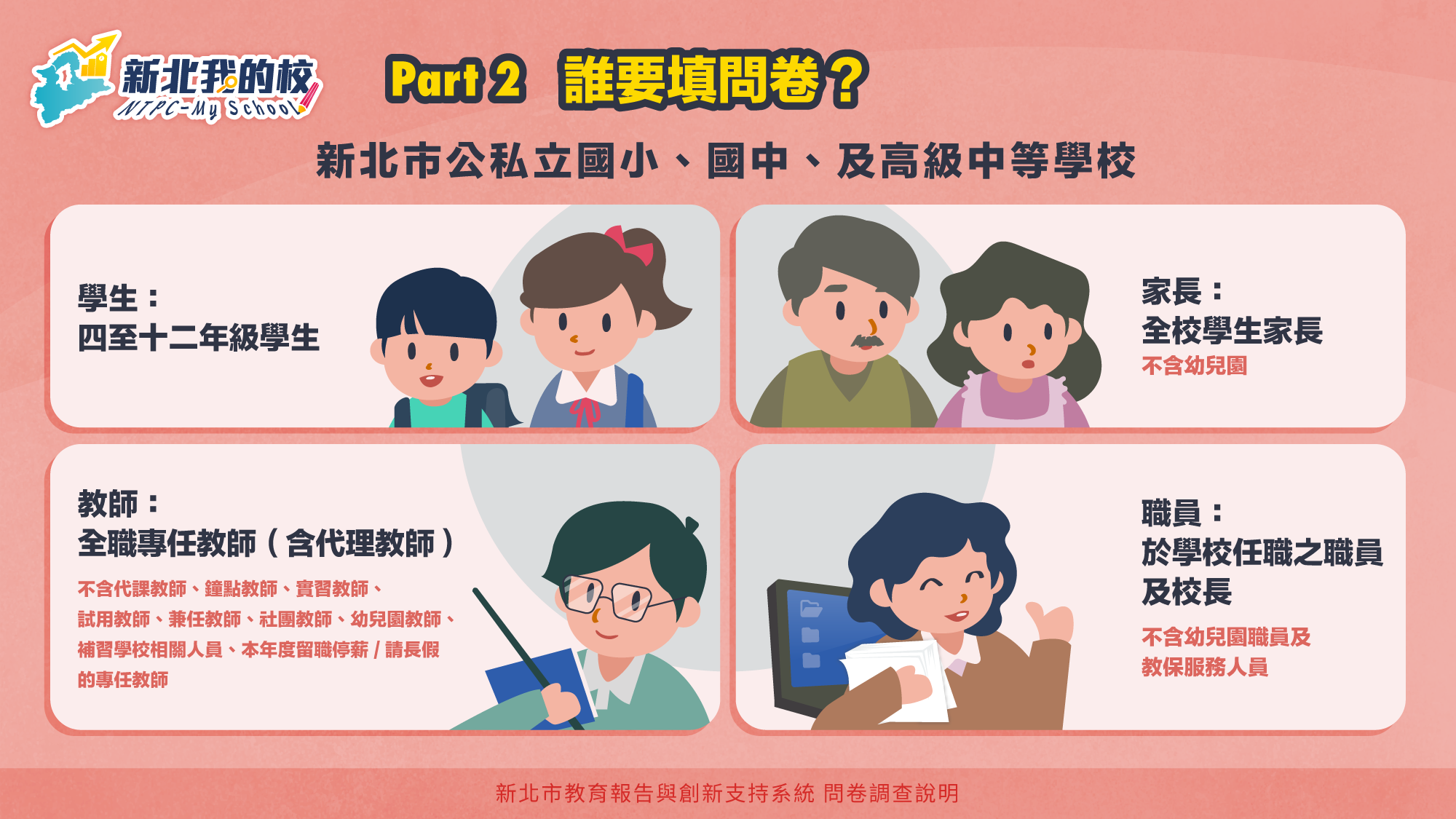 2.請全校師生、家長與教職員工自3/10(二)中午12時起至5/8(五)下午11時59分前至「新北市中小學教育報告與創新支持系統」網站填寫問卷。