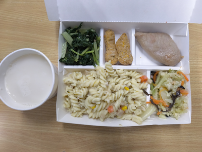 | 主食:卡邦妮蕈菇螺旋麵 | 主菜:麴醬燒豬排 |