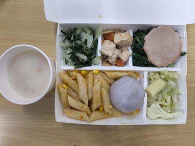 | 主食:茄汁義大利麵 | 主菜:素火腿 |