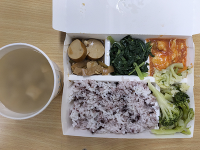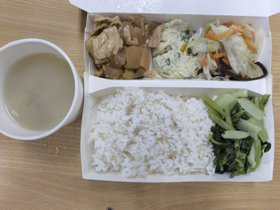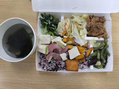 | 主食:紫米飯 | 主菜:三杯豆包 |