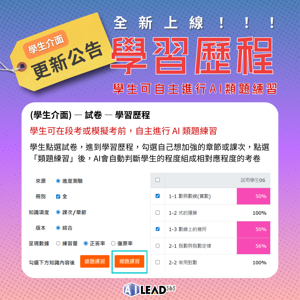 【自學】AILEAD365學生介面更新公告-學習歷程全新上線!學生可自主練習AI類題